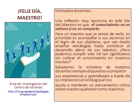 Centro de Idiomas de la Universidad del Pacifico is pleased to present our Research Group, which was created with the objective of being a place for reflection and debate on the pedagogical task in the field of language teaching. Within our initial activities, today we share with you the creation of the blog that we have nominated Language Teaching Bloggers.